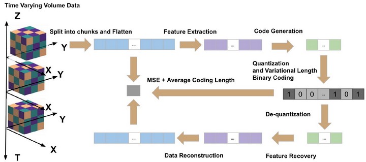 Our adaptive volume compression tool is designed to reduce time-varying volume data generated from scientific simulations. The tool leverages recent advances in deep learning architectures and simultaneously trains an encoder and a decoder. The encoder extracts features from each temporal-spatial chunk using several layers of convolutional neural network (CNN) followed by a discrete encoding layer that conducts quantization, and tries to spread the information evenly into each bit. The encoding binary representation then goes through a symmetric structure as the decoder for reconstructing the raw volume data. In this way, this autoencoder structure can learn a compact data representation while preserving most of the temporal-spatial structures of the original data. The following figure summarizes the pipeline of our approach.