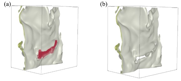 For example, our method can identify the specially shaped hole structure of a combustion simulation case, shown as the red color in the above image (a), on the frame structure shown in the image (b).